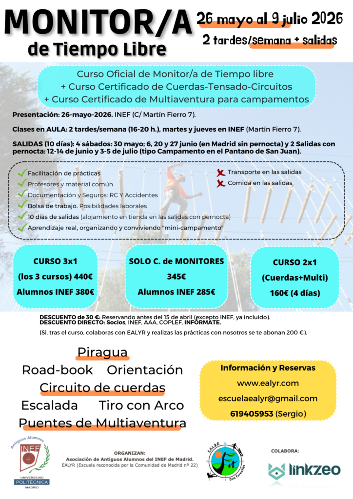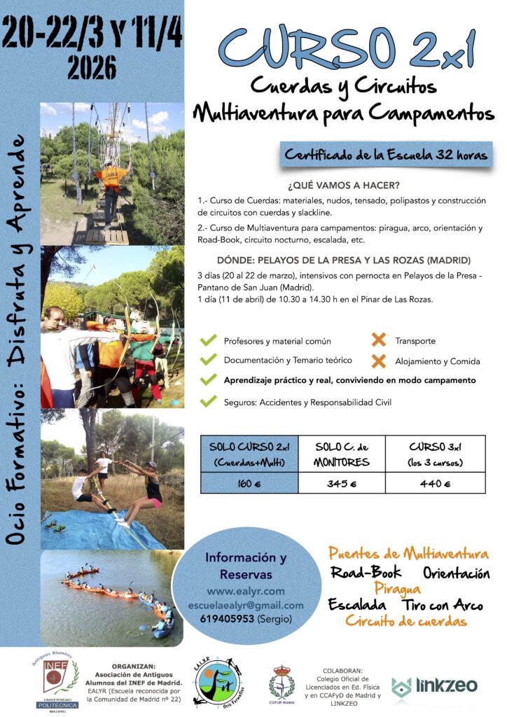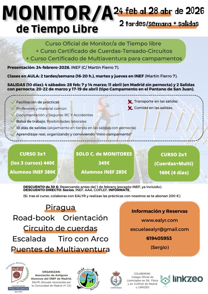 En el INEF de MADRID (Moncloa-Ciudad Universitaria). Curso Oficial de Monitor/a de Tiempo Libre + Curso de Cuerdas + Curso de Multiaventura para Campamentos.